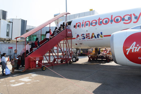 BANGKOK, THAILAND - 8 FEBRUARY, 2014: international tourist people boarding on Air Asian airplane boeing 737 in Don Muang Airport, the main hub specialized in internal flights and lowcost companies