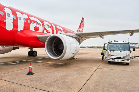PATTAYA, THAILAND - 18 NOV, 2016: Close-Up on Thai Air Asia Engine at Utapao International Airport at Pattaya, Thailand.