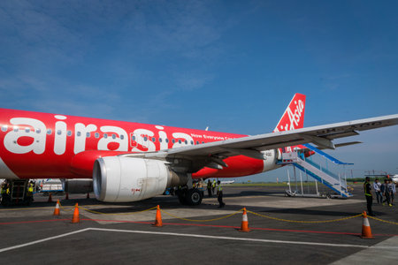 Semarang, Indonesia - October 2017: Air Asia Airbus landed at sunrise - Ahmad Yani International Airport, Semarng, Indonesia. Air Asia company is the largest low cost airlines in Asia.