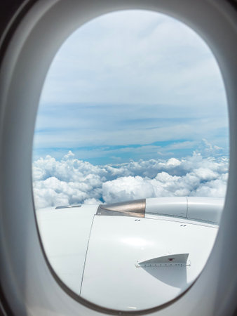air plane engine and wing floating over white cloud and blue sky use as background,backdrop