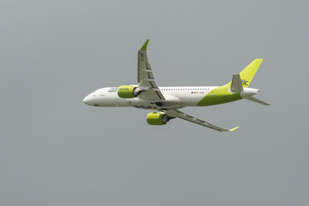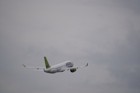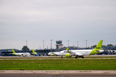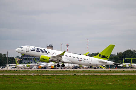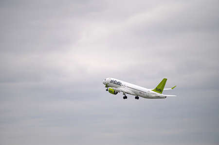 Riga, Latvia - August 31, 2021: AirBaltic Airbus A220-300 YL-AAS takes off from RIX International Airport on cloudy autumn day
