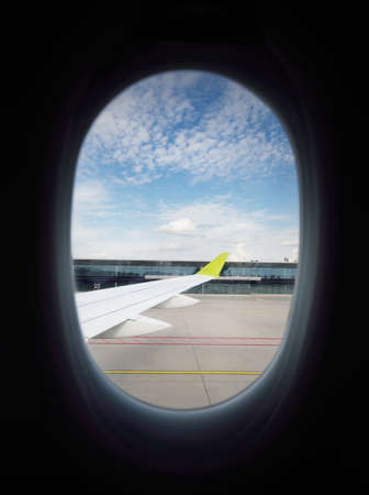 Passenger airplane on runway near the terminal in an airport . the interior of the plane and the view from the porthole