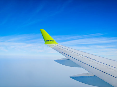 01 11 2026 - Dubai, United Arab Emirates. The view from the AirBaltic airlines airplane window during a flight. Airplane wing in front of blue sky