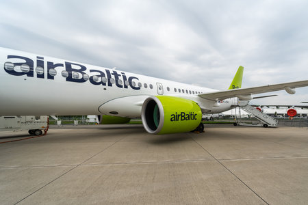 BERLIN, GERMANY - APRIL 25, 2018: Fragment of the narrow-body jet airliner Bombardier CS300, by AirBaltic. Exhibition ILA Berlin Air Show 2018.
