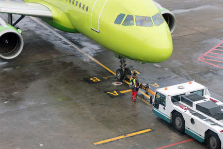 Towing the green aircraft from the runway to the Parking lot with the help of special equipment.