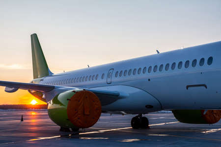 SAINT-PETERSBURG, RUSSIA - AUGUST 23, 2018: Aeroflot and S7 airlines plane was preparing for departure, the blurred image. The plane on the runway, tourism concept