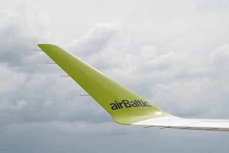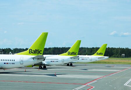 The tail of the airBaltic aircrafts at the passenger terminal at Riga Airport. June 20, 2019 Latvia.