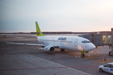 RIGA, LATVIA - MARCH 5: Air Baltic Boeing 737 airliner at Riga airport, March 5th 2014. Air Baltic is the Latvian flag carrier airline.