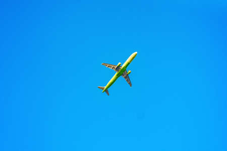 Adler, Russia, April 23, 2021. The plane is green, S7 Airlines, flying in the blue sky. air transport