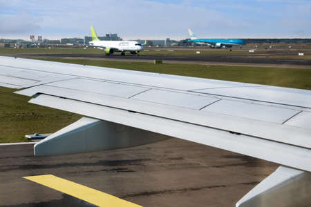 Aircraft prepare to take off from runway. Riga international airport, Latvia. Panoramic view from an airplane window. Transportation, connection, passengers, tourism, travel destinations, wanderlust