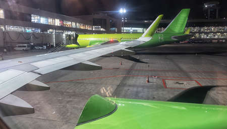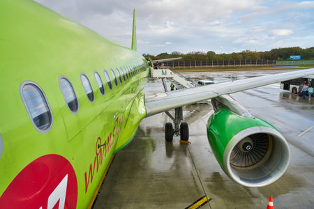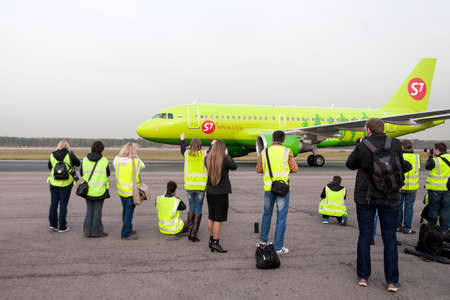MOSCOW, RUSSIA - SEPTEMBER 26, 2014: Spotter plane photographed S7 Airlines during taxiing. Moscow Domodedovo Airport organizes regular spotting on its territory.