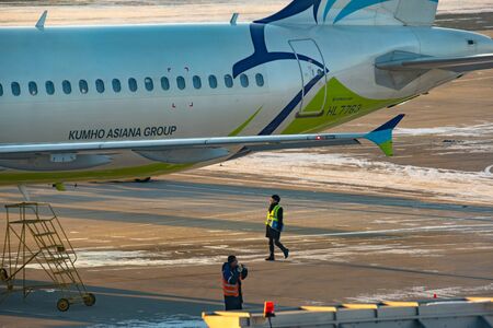 Vladivostok, RUSSIA - Jan 10, 2020: Airbus A321-231 HL7763 of the Air Busan airline preparing for takeoff at Knevichi airport
