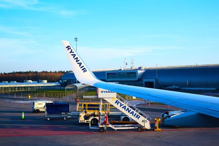 Modlin, Poland - November 17, 2019: Preparing for boarding to Ryanair plane in Warsaw Modlin airport in Poland. Ryanair operates over 300 aircraft and is the biggest low-cost airline company in Europe.