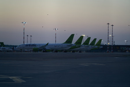 Riga, Latvia - March 19, 2020: coronavirus pandemic quarantine, flights canceled and airplanes parked for long standing at Riga International Airport