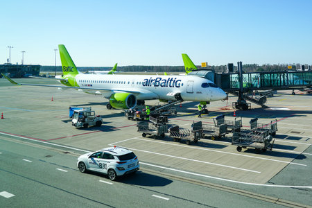 Riga, Latvia- March 05, 2024: Air Baltic passenger plane YL-ABE Airbus A220-300 at the gate in RIX Riga airport, airport equipment