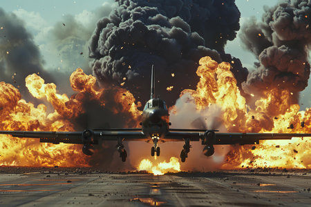 An aircraft evacuates the vicinity as a series of massive explosions and smoke clouds erupt in the background.. AI Generation