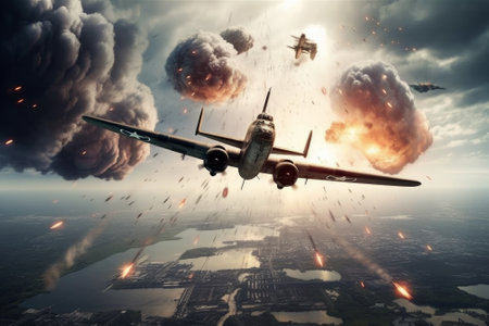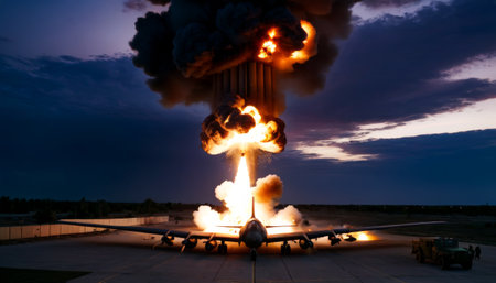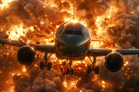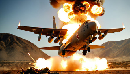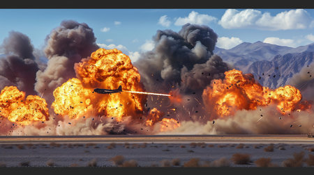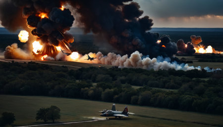 A dramatic scene captures a military jet flying low over a massive explosion, the flames and smoke reaching skyward. AI Generation