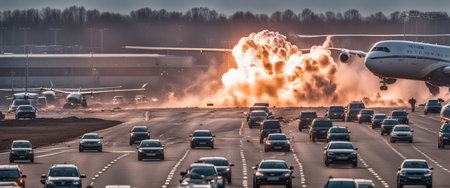 Plane crash airplane on runway catastrophe burning wrecks engine fire failure explosion fuel danger rescuing passengers commercial jet accident takeoff landing collision