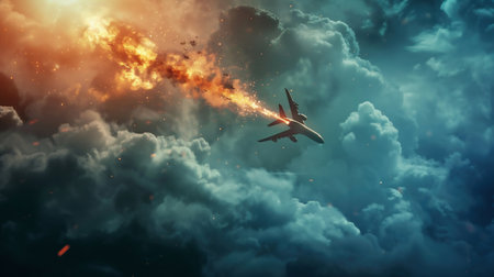 Aircraft explosion during flight. Airliner catastrophe. Plane accident in clouds. Generative AI.