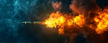 A powerful missile propels into the sky, surrounded by engulfing flames and smoke, showing the intensity of the launch under a starry night.
