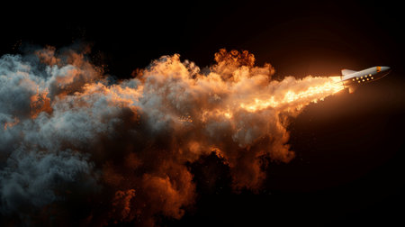 A rocket lifts off from a launch pad, releasing intense flames and thick smoke. The sky darkens as the vehicle ascends, marking a moment of thrilling excitement and technological achievement.