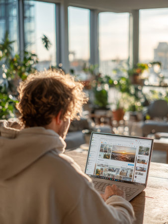 Man browsing website content on laptop, enjoying warm light in a green smart home
