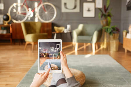 A woman relaxing holding a tablet and using a touch screen while comfortably lying down on a green carpet in a vintage flat interior with blurred background