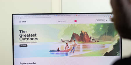 New York, USA - 26 April 2021: airbnb website page on screen, man using service, Illustrative Editorial
