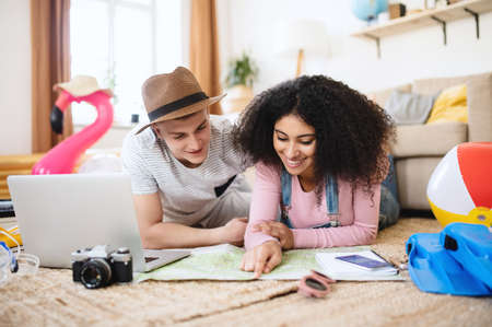 Travel Trip Holiday Vacation Destination Concept. Laptop and map on table