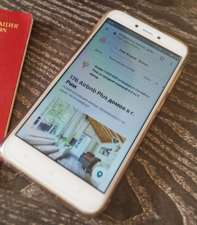 Kostroma Russia - July 25, 2018: Smartphone open apps airbnb application on the screen on the desk.