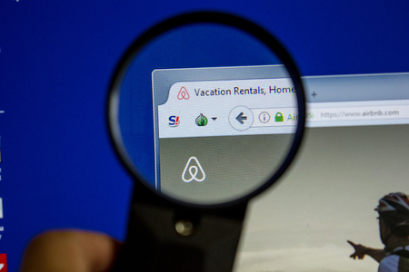Sankt-Petersburg Russia, January 11, 2018: Apple iMac with Airbnb homepage on monitor screen under magnifying glass . Airbnb is online marketplace offering service to rent short-term lodging. Homepage of Airbnb.com