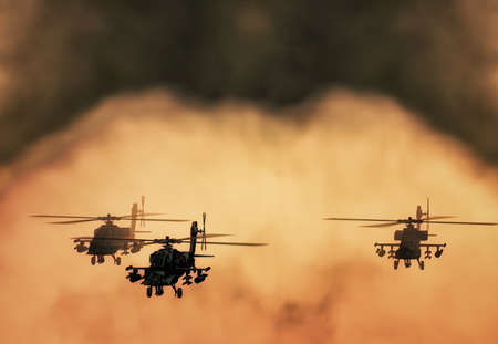 Silhouette of helicopter, soldiers rescue helicopter operations on sunset sky background. Copter in smog. 3D illustration