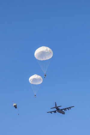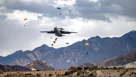 In a display of strategic power, a military transport aircraft executes a high-altitude airdrop over a rugged mountain range. Paratroopers and vital supplies descend under parachutes, demonstrating rapid deployment capabilities in a remote and challenging environment.