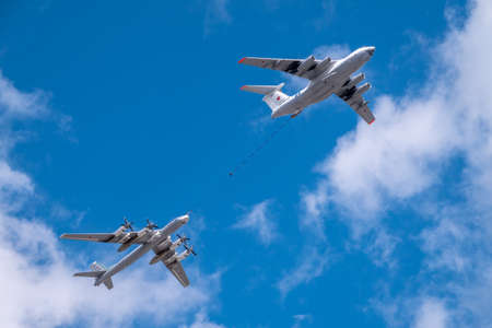 Moscow, Russia - May, 05, 2021: The group of strategic bomber of long-range aviation Tu-95ms and flying tanker Il-78m fly over the Red Square