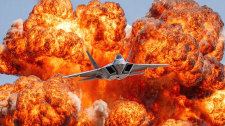 A jet fighter is captured mid-flight amidst a dramatic explosion. The scene is dominated by vibrant orange and red hues, indicating intense heat and energy. This dramatic composition could be used for illustrating concepts of conflict, power, or technological advancements. The image could be suitable for various commercial or editorial applications.