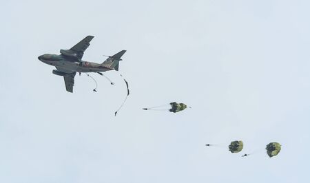 Military Army paratroopers display at air show festival.