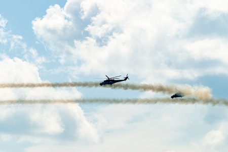 Russian Military attack helicopter shooting flares at the MACS air show in Moscow in a demonstration of Russian air power