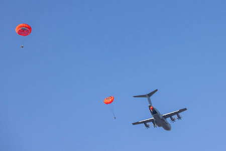 parachutists jump out of a military aircraft