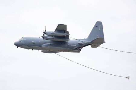 Louisville, Kentucky, USA - April 13, 2019: Thunder Over Louisville, United States Air Force HC-130 air refueling aircraft, performing a fly by over the Ohio river