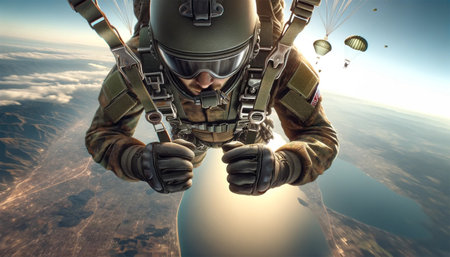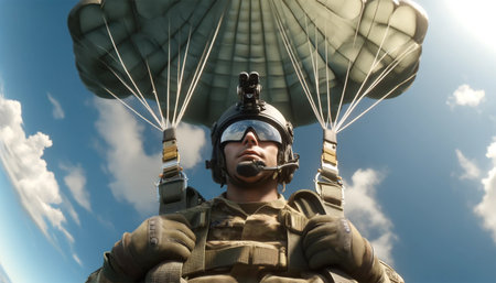 Military parachutist descending smoothly with a fully open parachute. The parachutist’s facial expression is concentrated. serenity, and their eyes are covered with tactical glasses, reflecting the vast expanse of the sky.