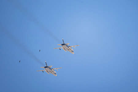 Fighter jet flies in the evening sky and smoke