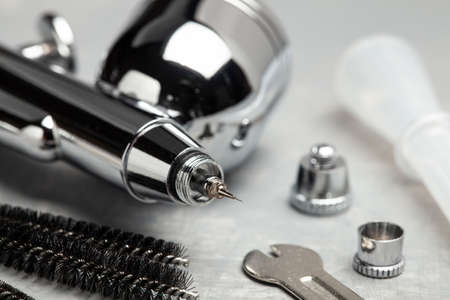 Airbrush cleaning. Brushes and other airbrush cleaning tools. Copy space for text.