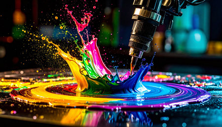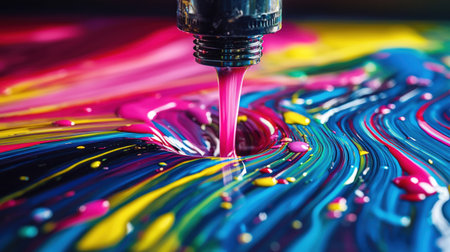 Dynamic spray nozzle unleashes a captivating flow of vibrant colors, creating a mesmerizing mix of artistic patterns perfect for creative inspirations.