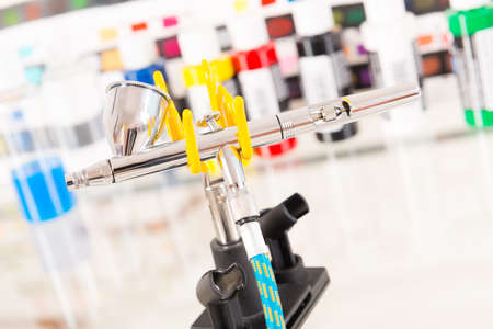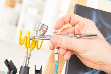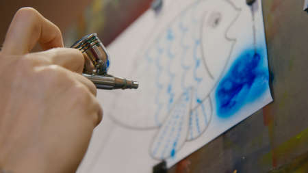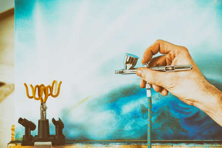 Woman artist learns to paint with airbrush with acrylic dye, paper and easel. Concept modern art, airbrushing, aerography, graffiti, aerosol spray