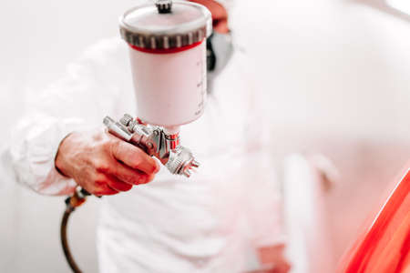 car worker and auto mechanic working and painting a red car using spray gun and compressor