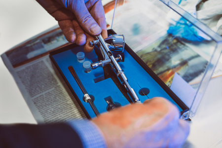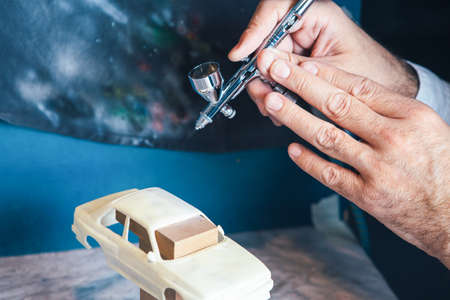 Hands of unrecognizable man using airbrush for painting handcrafted miniature auto.