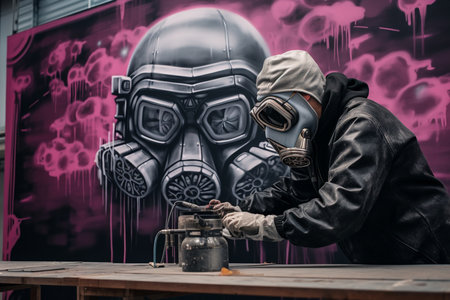 Graffiti artist in action, drawing on the wall with aerosol spray paint in a can, wearing protective face mask / respirator with filters. Street art culture concept.