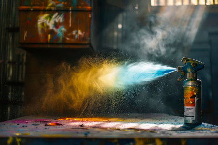 Spray can releasing a burst of vibrant rainbow-colored powder into the air on a dark background