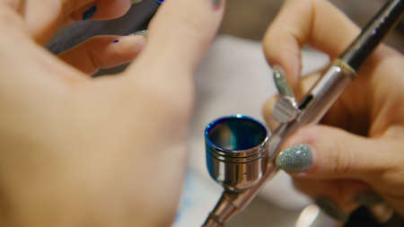 The hands of an employee of the shop painting and cleaning of the spray gun, close-up