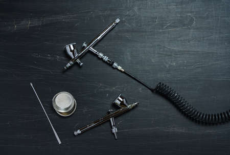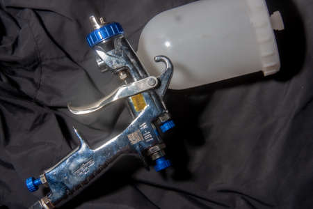 spray gun on wood table. in auto service. used for industrial painting and coating.